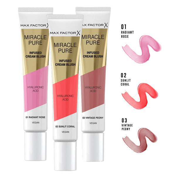 Tuotekuvaus Miracle Pure Cream Blush on runsaspigmenttinen, heleyttävä ja kosteuttava voidemainen poskipuna. Kevyt ja helposti levittyvä hoitava koostumus sisältää mm. glyseriiniä, hyaluronihappoa ja squalanea. Max Factorin Miracle Pure Cream voidemaisella...
