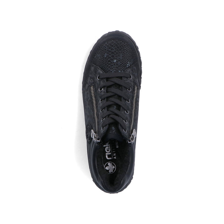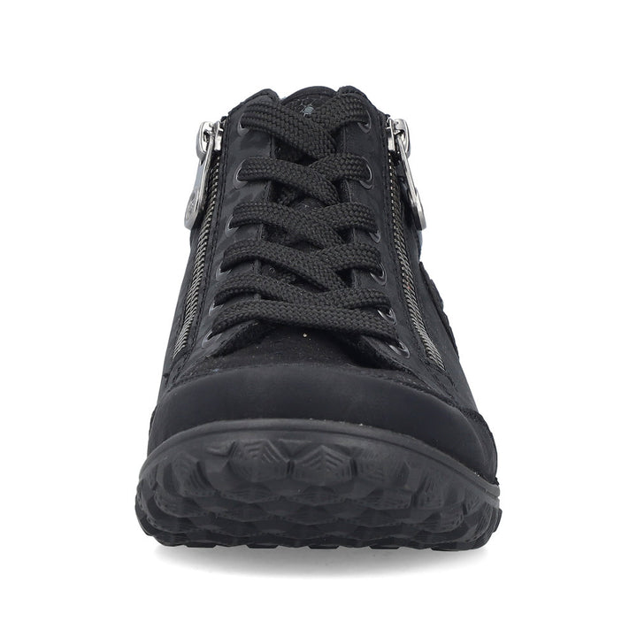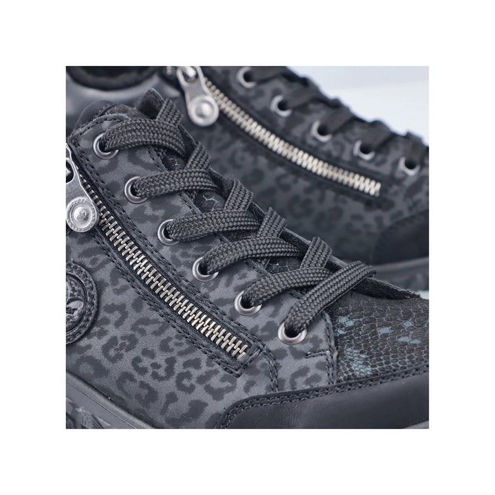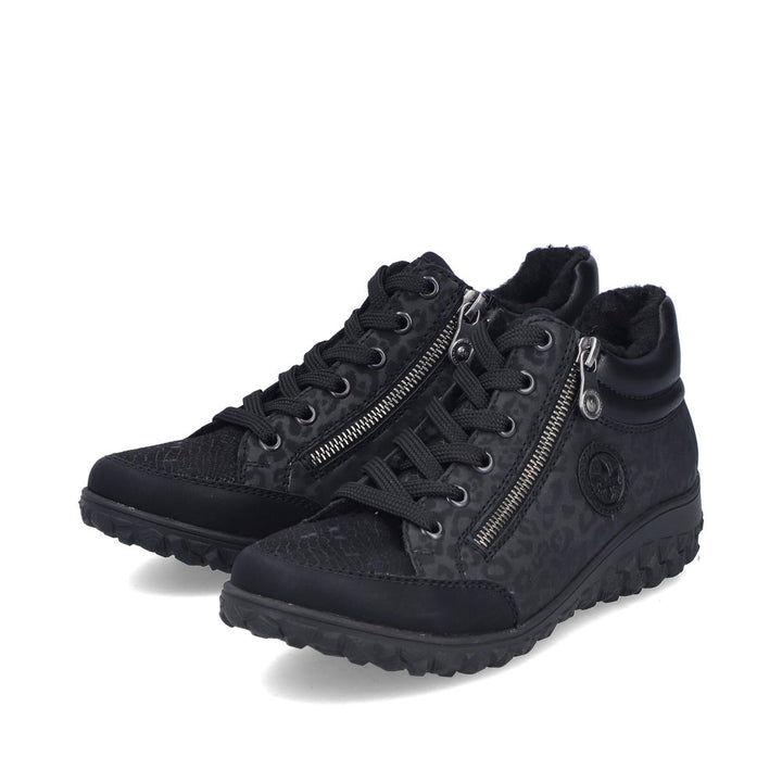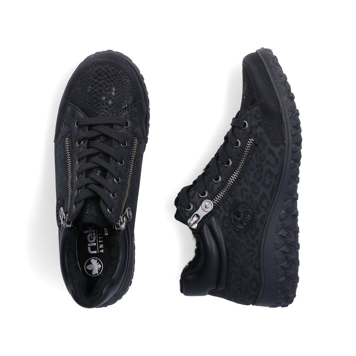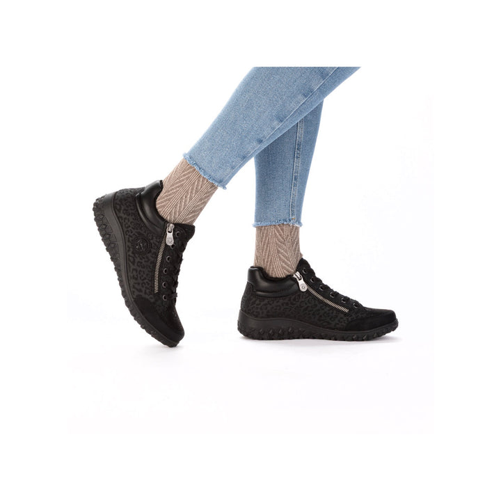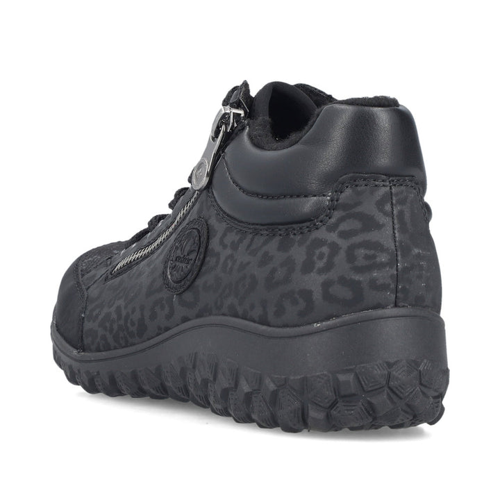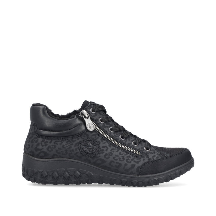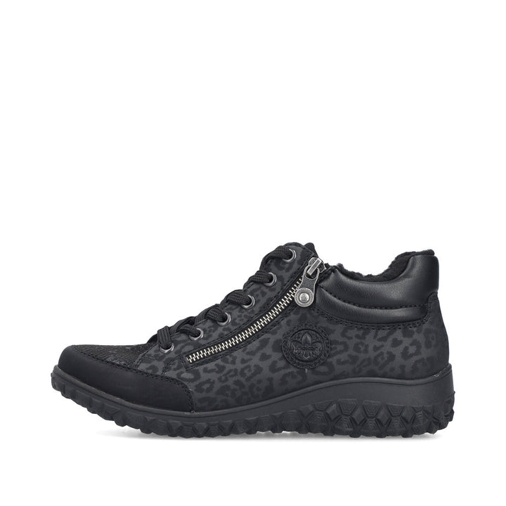 Näissä Rieker 59500-00 nilkkureissa yhdistyvät käytännöllisyys ja trendikkyys. Musta perussävy saa näyttävän lisänsä leopardikuosisesta yksityiskohdasta, joka tekee kengistä monikäyttöiset niin arkeen kuin vapaa-aikaan. Nauhoitus ja sivuvetoketju varmistavat tukevan ja mukavan istuvuuden.