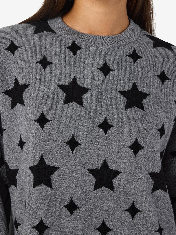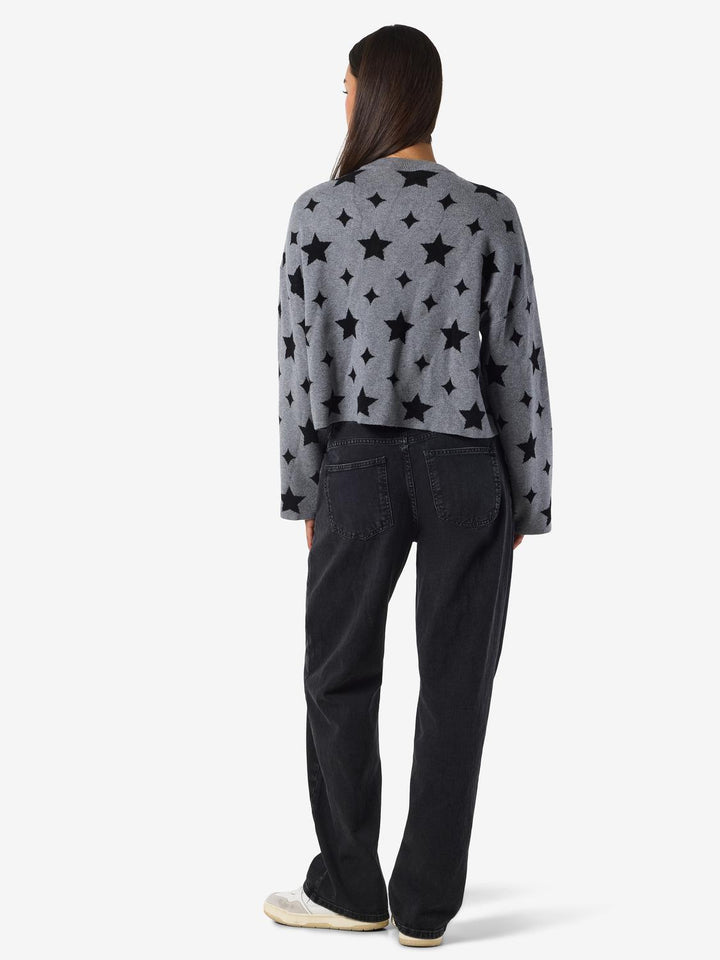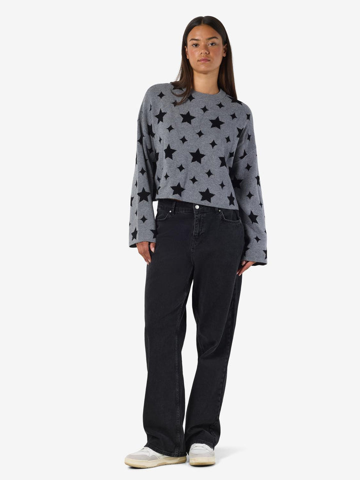 Tämä Noisy May tähtineule yhdistää mukavuuden, modernin muotoilun ja vastuulliset materiaalit. Harmaa neulepusero, jossa on mustia tähtiä, tuo asuun hauskaa kontrastia ja persoonallisuutta. Pehmeä tasoneulos tekee siitä täydellisen jokapäiväiseen käyttöön.